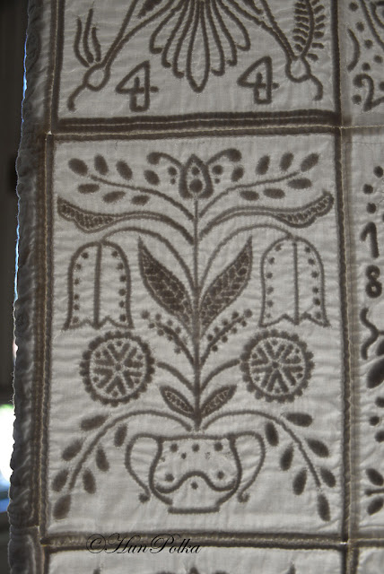 Adobe Photoshopie tak, aby było widać co tam jest wypikowane. W rzeczywistości są śnieżnobiałe jak cały piec. Wypikowany tekst podaje źródło wzorów, kto wykonał quilt i z jakiej okazji go uszyto.